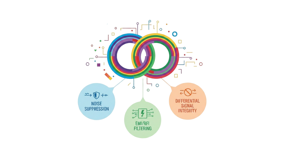 Ferrite cores are the most popular because of their high permeability and affordability. They are extensively utilized in consumer, industrial, and automotive electronics for high-frequency EMI suppression. Because of their performance, they can be used with both through-hole and compact SMD chokes.